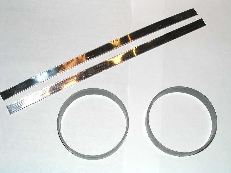 | aus einem PVC Rohr wird ein 12mm starker Abschnitt abgetrennt, plangeschliffen und dann dieser entstandene Ring später aufgetrennt. Aus dünnen Aluminium Blech ( 0,6 - 0,8mm ) werden 8mm starke Streifen geschnitten. Diese werden so auf Länge gebracht, das sie im Ring eingelegt, am Ring einen ca. 1mm Luftspalt ergeben. | |||||||||||||