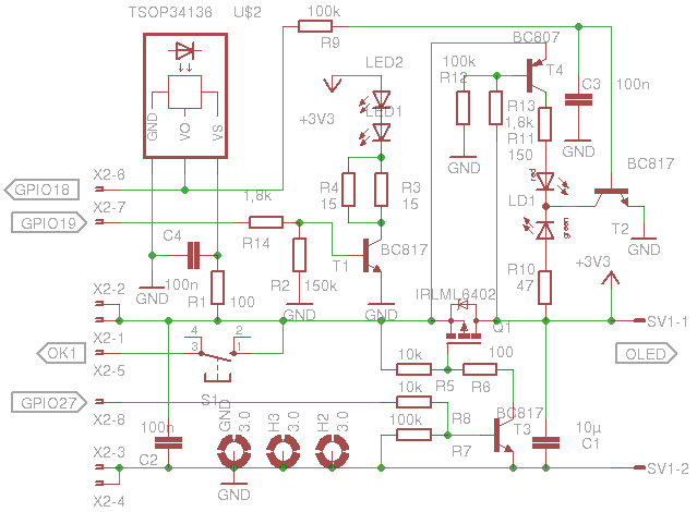 Der TSOP 34136 empfängt die IR Daten und leitet diese an den GPIO18 vom RPI . Parallel dazu kommen die IR Daten zum Wake-Up Controller und über R9 zum T2. Dadurch werden die IR Signale auf das Dauerlicht der Duo Led aufmoduliert und diese flimmert dezent beim Empfang von IR Signalen. Vom GPIO Pin 19 bekommt T1 das IR Sende Signal. Die Leds 1 und 2 sind IR Sende Dioden. Der Taster S1 legt bei Betätigung High Pegel auf die Transistorstufe vom Optokoppler zum Schalten von RPI P6. Wenn GPIO Pin 27 vom RPI High Pegel erzeugt, schaltet T3 durch und zieht damit das Gate vom IRML6402 gegen Masse. Dadurch schaltet das Mosfet durch und das OLED Display wird eingeschaltet. LD1 ist eine Duo Led rot/grün . Ist das Mosfet geschaltet, leuchtet die grüne Seite von LD1. Ist das Mosfet gesperrt, verlöscht grün von LD1 und die Basis von T4 bekommt über R13 negative Spannung und T4 schaltet. Dadurch leuchtet jetzt die rote Seite von LD1. | ||||||||||||||||||||||||||