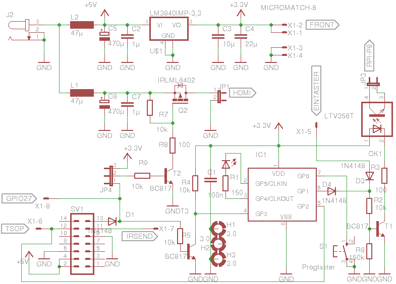 Über J2 wird das Gerät mit Spannung versorgt. Ein LC Tiefpass eliminiert Netzstörungen. Der LM3940 erzeugt 3,3 Volt für die Baugruppen Wake-Up Controller, OLED Display, TSOP IR Empfänger, IR-Sender. Ein Power Mosfet IRML6402 schaltet die Spannung für den HDMI Splitter ein. Ein Wake-Up Microcontroller wertet die IR Signale aus und steuert entsprechend über eine Transistorstufe einen Optokoppler, der dann einen Reset am Anschluss P6 auf dem RPI zum Booten auslöst. Mit J4 kann festgelegt werden, ob der RPI den HDMI Splitter während des Bootvorgangs einschaltet, oder ob der Splitter dauerhaft eingeschaltet bleibt. Dies ist für Servicezwecke oder zur Fehlersuche sinnvoll. | ||||||||||||||||||||||||||