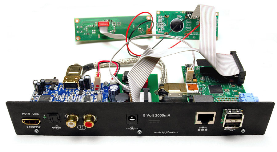 Hier geht es nun um den Hardware Aufbau. Ich hatte mir das Ziel gesetzt, ein vollständiges Gerät zu bauen, welches sich mittels Fernbedienung einschalten und steuern lässt, HD Inhalte dem Fernseher zuspielt und den Ton über die HiFi Anlage abspielt. Das ist grundsätzlich auch kein Problem für den RPI, jedoch kann ich den HDMI Ton nicht über meine ältere HiFi Anlage verarbeiten. Der RPI besitzt zwar auch einen analogen Soundausgang, dieser ist aber von äußerst miserabler Qualität. Zum einem werden an diesen Ausgang alle möglichen digitalen Störsignale aus dem Prozessor Umfeld mit übertragen, zum anderen besitzt der analoge Soundausausgang vom RPI keinen DAC wie allgemein üblich, sondern erzeugt das Signal mittels PWM (Pulsweitenmodulation) über einem Tiefpass. Und das klingt schrecklich (nähere Informationen und Messungen dazu findet man auch hier). Eigentlich würde eine gute USB Soundkarte das Problem mit dem Sound lösen, auch Hifiberry und Co wären eine Alternative. Jedoch funktionieren alle diese Lösungen momentan nicht mit dem rpihddevice. Darum habe ich einen anderen Weg für einen guten Sound gesucht. Ein HDMI Splitter entkoppelt den Ton aus dem HDMI Signal und wandelt es digital nach S/PDIF (Toslink) bzw. Analog Stereo um. Diesen HDMI Splitter habe ich mit ins Gerät integriert. Weiterhin ist ein Infrarot Empfänger eingebaut, der die Signale einer Fernbedienung empfängt und zum RPI leitet. Auch ein Infrarot Sender ist installiert. Mit diesem kann ich meine alte HiFi Anlage über den VDR mittels Infrarot steuern. Als optische Anzeige habe ich ein sehr leuchtstarkes und kontrastreiches OLED-Display zur Informations-Anzeige eingebaut . Weiterhin zeigt eine Duo Led im Einschalt-Taster verschiedene Betriebszustände an und gibt auch optisches Feedback beim benutzen der IR Fernbedienung. Für diese Funktionen habe ich zwei Platinen entwickelt. Diese sind für Selbstätzung optimiert, also mit stärkeren Leiterbahnen und 2-3 Drahtbrücken für einseitiges Leiterplatten-Layout. |