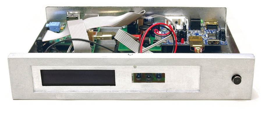 Das Gehäuse besteht aus zwei U-förmigen Teilen, die das Ober und Unterteil ergeben. Diese sind aus 0,8mm Aluminiumblech gefertigt. In die Frontplatte sind Gewindebolzen und Plastikhülsen eingelassen, um das Display und die Frontplatine befestigen zu können. Die Platinen vom RPI , Wake-Up Controller und HDMI-Splitter sind auf einem 1,5 mm starken Montageträger montiert. Dort sind diese über Gewindebolzen und 10 mm Distanzhülsen befestigt. Der Montageträger wird dann an die Unterschale vom Gehäuse befestigt. An dem Montageträger ist auch die Rückblende befestigt. | ||||||||||||||||||||||||||