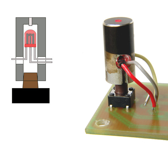 Die Duo LED ist in die Fronttaste des Einschalters integriert. Den Tastenkörper habe ich aus 8mm Aluminium gedreht und schwarz hart-eloxiert. Vorn ist eine 1,5 mm Bohrung eingebracht, in der ein transparenter 1,5 mm Faden von einem Rasentrimmer eingepresst wurde. Dieser fungiert als Lichtleiter. Von hinten habe ich den Tastenkörper auf 3,2 mm aufgebohrt und geschlitzt. So konnte ich dort die 3 mm Duo LED versenken und einkleben. Dann wurde der Tastenkörper auf den Taster geklebt. | ||||||||||||||||||||||||||