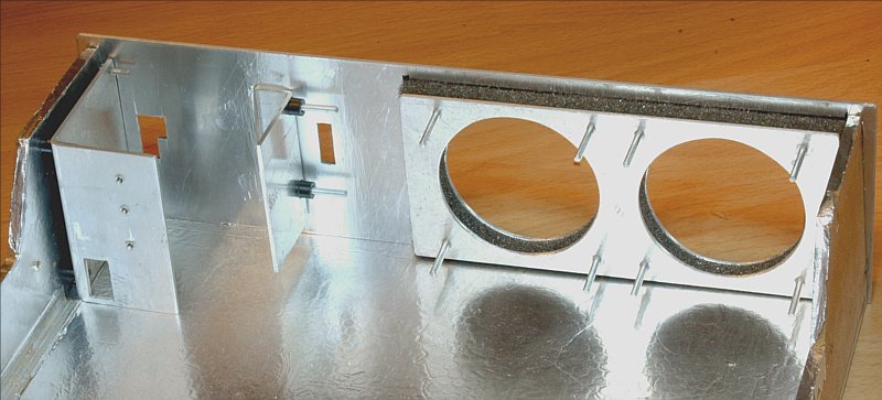 Das Unterteil ist aus 5mm HDF (hochdichte Faserplatte) gefertigt. Dadurch werden Schwingungen der Massenspeicher weitgehend absorbiert. Das Unterteil besitzt vorn rechts eine t-förmige Öffnung. Über diese wird von unten kalte Luft angesaugt. Diese kühlt dann die HDD-Kühlrahmen und wird hinten rechts über die Lüfter heraus geführt. Die Rückwand trägt hinten links das Kühlblech für die Stromversorgung, in der Mitte die Halterung für die eSATAp Buchse und rechts der Lüfterrahmen. Dieser ist mittels 5mm starkem Schaumgummi entkoppelt. Eine dünne Aluminium Haushaltsfolie schirmt das Unterteil ab. | |||||||||||||||||||||||||||||||||||||||