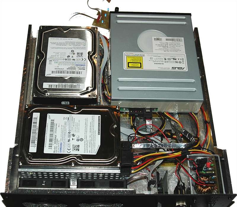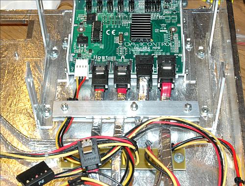 die vom Netzteil erzeugten Spannungen gelangen auf eine Stromverteilerschiene, hierüber ist die 4. Festplatte fest angeschlossen, sowie das BR-Laufwerk, der SATA-Controller und die Steuerplatine für die geschalteten Festplatten.