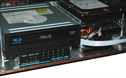 Im Folgenden beschreibe ich den Bau eines ferngesteuerten externen eSATAp Cases für 4 HDDs + ROM. Ein 5-Port SATA II Port Multiplier von Dawicontrol (DC-6510 PM) bildet dabei die Kommunikationsschnittstelle zwischen dem PC und den Massenspeichern. Das Case fungiert als Slave und wird über den PC gehandled. Ein Microcontroller steuert im Case die HDDs software-gesteuert, |