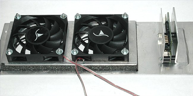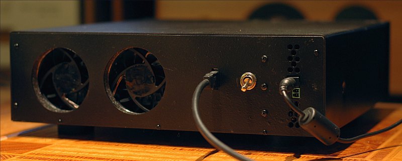 Die Rückwand trägt das Netzteil, den eSATAp Connector und den entkoppelten Doppellüfter bestehend aus 2 Stück 70x70x10 Low-Noise Lüfter, die ca. mit 500Upm arbeiten. Das Netzteil gibt seine Abwärme direkt an die Rückwand ab, diese ist auch aus 1,5mm starkem Aluminium Blech gefertigt. | |||||||||||||||||||||||||||||||||||||||
