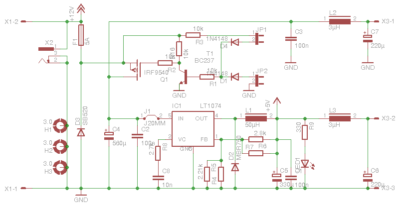 Das Netzteil wird über X1 (RIACON-Buchse) bzw. X2 (5,5mm Hohlbuchse) mit 12 Volt versorgt. Über JP2 wird das Schaltsignal 5 Volt, welches über Power vom PC kommt und über den Ein/Aus Schalter an der Front geschleift ist, dem Q1 zugeführt. Parallel dazu werden über JP1 über den rückseitigen Kippschalter 12 Volt angelegt. Dadurch kann das Case entweder über den Kippschalter an der Rückwand manuell eingeschaltet werden, oder über die 5 Volt Steuerung des PCs. Der IC1 wandelt die 12 Volt in 5 Volt und kann max 5 Ampere bereitstellen. An der RIACON Buchse X3 liegen dann die geschalteten 12 Volt und 5 Volt für den Betrieb des Cases bereit. | |||||||||||||||||||||||||||||||||||||||