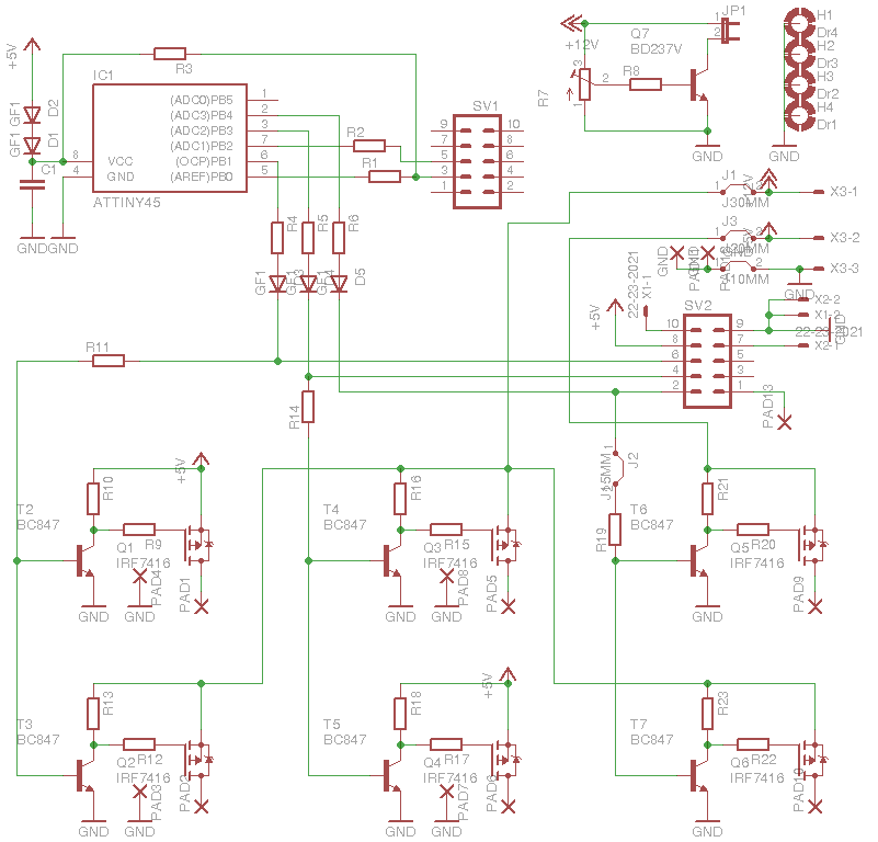 Über SV1 erhält der Microcontroller Attiny 45 das USB Signal vom PC und schaltet dementsprechend seine Ausgänge auf High. Dieses Signal gelangt dann zum SV2, welches zur Frontplatteneinheit läuft und parallel zu den Treiberstufen für die HDDs. An die PADs 1 - 12 werden die SATA Kabel für die zu schaltenden Festplatten angeschloseen. An JP1 wird die Lüftereinheit angeschlossen, mit R7 kann die Lüfterdrehzahl von 0 - 100% justiert werden. | |||||||||||||||||||||||||||||||||||||||