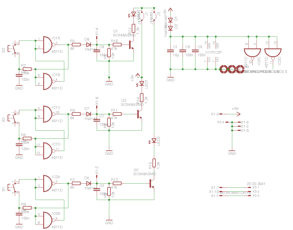 die vom SV2 zum X1 gelangten Signale schalten Q1 - Q3 und lassen die LED 1 - 3 für die jeweilige HDD an der Frontplatte leuchten. IC 1 und IC2 bilden 3 Flip-Flops, welche per Tipptaste den Schaltzustand speichern und dann ein High Signal auf X1 geben, um die Festplatten manuell schalten zu können. | |||||||||||||||||||||||||||||||||||||||