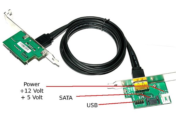 Für die Kommunikation zwischen dem PC und dem eSATAp Case ist ein spezielles eSATAp Kabel zuständig. Dieses überträgt neben SATA, USB auch Power 12 Volt sowie 5 Volt. SATA überträgt dabei die Daten und USB die Steuersignale, damit der PC die HDDs handeln kann. Über die Power-Leitungen kann das Case insgesamt ein bzw. ausgeschaltet werden.