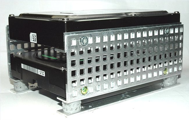 Der HDD Laufwerkskäfig nimmt zwei Festplatten huckepack auf. Damit diese ausreichend gekühlt werden können, sind die Laufwerkswinkel mit Wärmeleitkleber am Lochblech verklebt. Dadurch kann auch seitlich die Luft durch den Käfig strömen. Der gesamte Laufwerkskäfig lagert auf 4 Silikon-Dämpfern, sodass niederfrequenter Körperschall nicht auf das Gehäuse wirken kann.