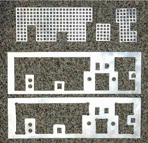 Die Rückwand besteht aus mehreren Blechen. Diese habe ich wegen der vielen Anschlüsse aus 2 Stück 1mm Blechen gefertig, welche nach den Aussägen mit einander verklebt wurden. In die gesägten Ausschnitte habe ich dann 1mm starkes Lochblech geklebt. | |||||||||||||||||||||||||||||||||||||