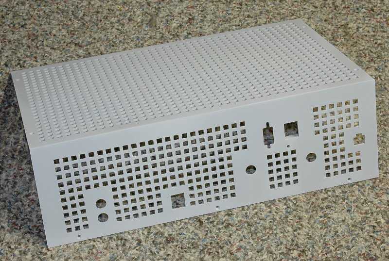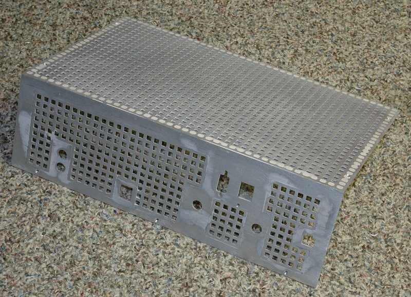 das Gehäuse für den Stream Server habe ich aus einigen Platten Aluminium Blech hergestellt. Da sich die Hardware durch Eigenkonvektion kühlen muß, habe ich für großen Lufteintritt im Bodenbereich gesorgt. Die Bodenplatte besteht aus 2mm gestanzten Lochblech. Seiten und die Frontplatte sind aus 3mm starken eloxierten Alu Blech gefertigt. Die einzelnen Teile sind mit Winkeln und 2-Komponenten Klebstoff miteinander verbunden. | |||||||||||||||||||||||||||||||||||||