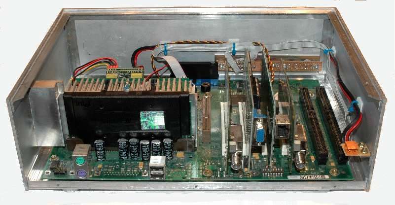 die Stream-Server Hardware besteht hauptsächlich aus handlesüblichen PC Komponenten. Grundlage hierfür bildet ein Siemens Motherboard D1141 mit der Intel CPU Coppermine 650, einer Netzwerkkarte 3Com 3c905, einer Grafikkarte SiS PCI 2MB, sowie 2 DVB-Sat Karten TechnoTrend TT-budget S-1401. Weiterhin befinden sich noch 256Mb Ram Speicher auf dem Board. Als Boot-Medium und Speicher fürs Betriebssystem dient ein IFM 1GB von Transcend Stromversorgung des Stream-Servers übernimmt ein DC/DC Wandler vom Typ PicoPSU 120. Dieser wird von einer zentralen 12 Volt Versorgung gespeist. An der Frontseite befinden sich einige Steuer und Anzeige Elemente. Diese sind von links nach rechts der Einschalter , ein versenkter Resetknopf, ON/OFF/Standby LED, IDE Aktivitäts LED, Netzwerk Aktivitäts LED, und weiterhin geplant noch zwei LEDs für den Arbeitsstatus der Sat Karten. Um eine weitgehend selbstständige Funktion erreichen zu können, überwacht dann ein Hardware Watchdog den Zustand des Servers und setzt ihn gegebenenfalls zurück. |