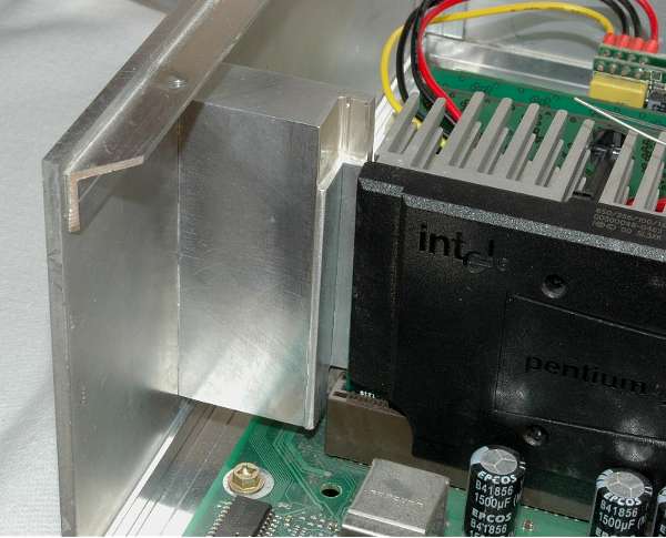 An den passiven CPU-Kühlkörper habe ich einen massiven Alu Block mit wärmeleiteten Arctic Silver Kleber befestigt. Dieser Block wird dann mit Wärmeleitpaste an die Seitenwand des Gehäuses geschraubt.
