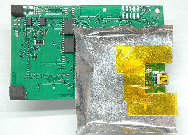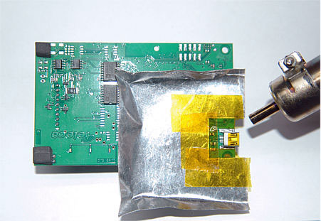 Um die USB-Buchse zu entfernen, benutze ich eine Heißluft-Lötstation. Damit die benachbarten Bauteile auf der Platine nicht in Mitleidenschaft gezogen werden und Schaden nehmen, habe ich diese mit Hochtemperaturklebeband und Alufolie geschützt. Mit ca. 350°C ließ sich die Buchse rasch entlöten. | |||||||||||||||||||||||||