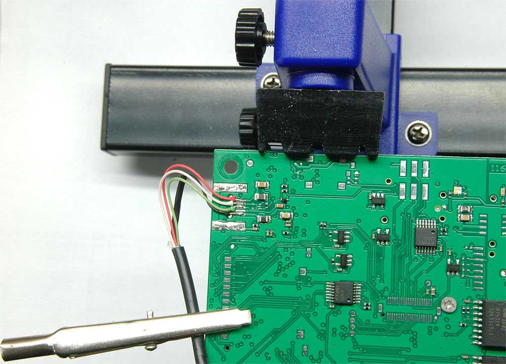 das vorbereitete USB Kabel wird nun entsprechend der obigen Angabe direkt auf die Pads der ausgebauten USB Buchse gelötet. Hier sieht man, das die Abstände recht gering sind und sich nur relativ dünne Kabel dafür eignen.