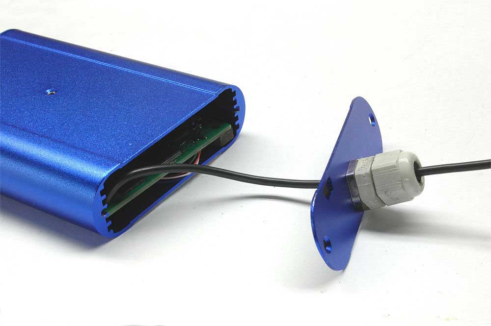 nach einem ersten Funktionstest kann die Platine in das Gehäuse eingesetzt werden. Vor dem Löten habe ich in das Seitenteil eine Zugentlastung eingebaut. Durch diese ist dann das Kabel gezogen worden. Da der Ausgang der Zugentlastung etwas in das Gehäuse hinein ragt, musste dieser etwas versetzt eingebaut werden, um Freiraum über der Platine zu haben. Da die USB Lötanschlüsse auf der Unterseite der Platine liegen, habe ich das Kabel durch eine seitliche 3mm Bohrung der Platine gezogen.
