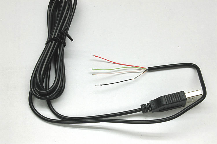 Für den Umbau habe ich ein dünneres USB Kabel aus einer ausgedienten USB Maus verwendet. Dies hat den Vorteil, daß das Kabel insgesamt wesentlich dünner ist, sich im Gehäuse gut verlegen lässt und auch die Einzeladern entsprechend dünner sind. Das ist notwendig, da die Lötabstände der Pads auf der Platine recht gering sind. Das Kabel ist 5-adrig. Neben den Datenleitungen , der Versorgungsspanung und Masseleitung ist auch der Kabelschirm extra beschaltet. Den Schirm habe ich mit der schwarzen Masseader verbunden und gemeinsam isoliert. | |||||||||||||||||||||||||