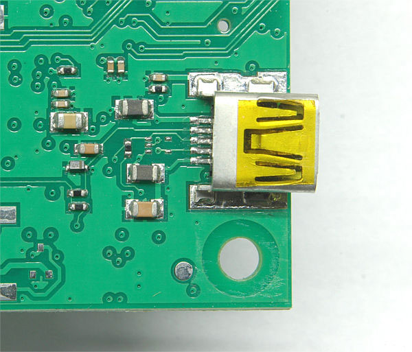 Hier ist die USB Mini-B Buchse zu sehen sowie deren Belegung. Diese Buchse besitzt 5 Kontakte. Pin 4 ist das ID-Pin. Hierüber sollte bei OTG Geräten eine Unterscheidung zwischen Host und Peripherie gegeben werden, indem dieser Kontakt GND Potential besitzt oder nicht. Dieses Pin wird aber in unserem Fall nicht genutzt. Zumindest nicht für die Zusammenarbeit mit dem PC. Beschaltet ist das Pin und wird auch weiter auf der Platine geführt. Möglich ist, daß das Gerät intern noch andere Möglichkeiten zur Nutzung besitzt.