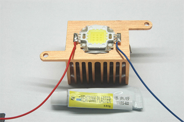 mit Wärmeleitkleber wird das COB Modul auf dem Kühlkörper befestigt