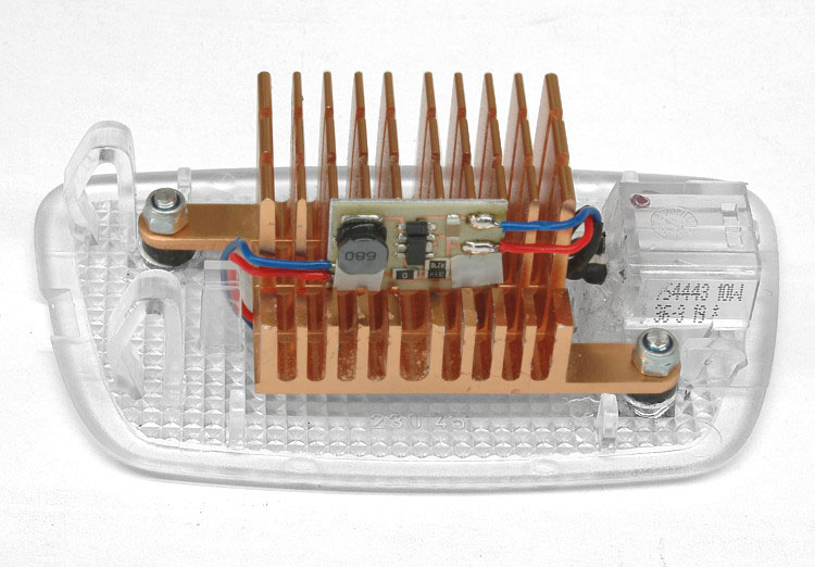Die Konstantstromquelle selbst ist auf einer Leiterplatte mit Aluminium-Kern montiert. Durch den direkten Kontakt mit dem Kühlkörper kann das IC die Temperatur der LED ermitteln. Durch die interne TSD-Funktion (Thermal shutdown protection) des IC wird bei hohen Temperaturen die Leistung reduziert. Die Kühlleistung sollte dann für den Betrieb in der Heckklappe auch bei höheren Temperaturen insgesamt ausreichend sein. |