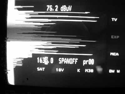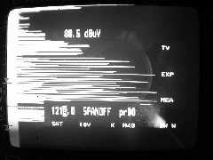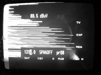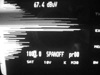 Jetzt können wir unser Programm Bahntv einstellen. Da es wie alle og. Im Low Band positioniert ist und Horizontal = 18Volt benutzt, brauchen wir nur die Frequenz auf 1806 Mhz zu stellen und um 7° in Richtung West zu drehen . Hier sehen wir ganz deutlich einen Satelliten , welcher ein charakteristisches Spectralbild erzeugt. |