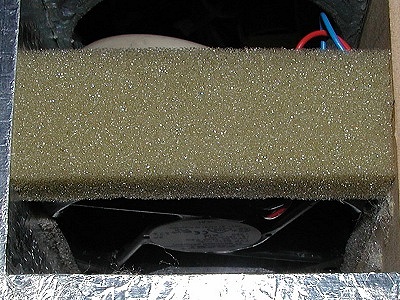 Der Abluftkanal hat eine Breite von 85mm, bedingt durch die Bauhöhe des Netzteils , der Lüfter 80mm . An die Seiten des Lüfters werden 3,5 mm breite Schaumgummi-Dichtungsstreifen (Fensterdichtung) geklebt. Unter den Lüfter kommt ein 85x30x30mm großer Schaumgummiblock als Auflage für den Lüfter zum Tragen. Jetzt wird der Lüfter paßgenau in den Abluftkanal plaziert. Über den Lüfter wird nochmals ein 85x30x30mm großer Schaumgummiblock eingesetzt. |