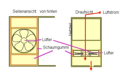 Hierdurch konnte der Lüfter wirkungsvoll entkoppelt werden . Der Lüfter wird nun mit den 12 Volt Anschlüssen des Netzteils gekoppelt. Durch einen schmalen Schlitz wird die Abwärme aus dem Netzteil herausgeführt. |