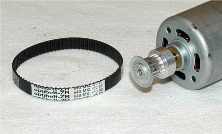 der Zahnkranz vom Motorvorgelege hat 23 Zähne vom Typ MXL 0,08" (2,032mm). Auf der Motorwelle sitzt eine Zahnscheibe mit 16 Zähnen MXL. Der Zahnriemen MXL 80 hat eine Zahnriemenbreite von 1/4" (6,35mm) und besteht aus Neopren mit Glasfaserzugstrang. Bei maximaler Motordrehzahl beträgt die Drehzahl auf der Motorvorgelegewelle ca. 12.500 U/min | |||||||||||||||||||||