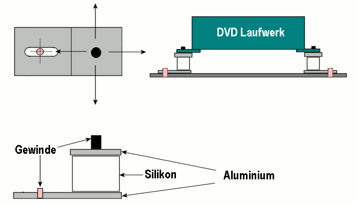 Zum Einsatz kam ein Atapi Lw DSL-710a ( techn. Daten HIER) . Bei diesem Lw ergaben sich noch weitere Vorteile. Erstaunlicherweise verhält es sich wie ein Single Session Lw und ist somit Playerkonform in punkto Kopierschutz, weiterhin hat es eine besonders gute Fehlerkorrektur die auch das Abspielen von stark geschädigten Scheiben erlaubt. Um dieses Lw im VDR 2 montieren zu können habe ich mir entsprechende Silikondämpfer gefertigt, welche die notwendige Bauhöhe einstellen und das Laufwerk millimetergenau zur Frontblende justierbar machen. |