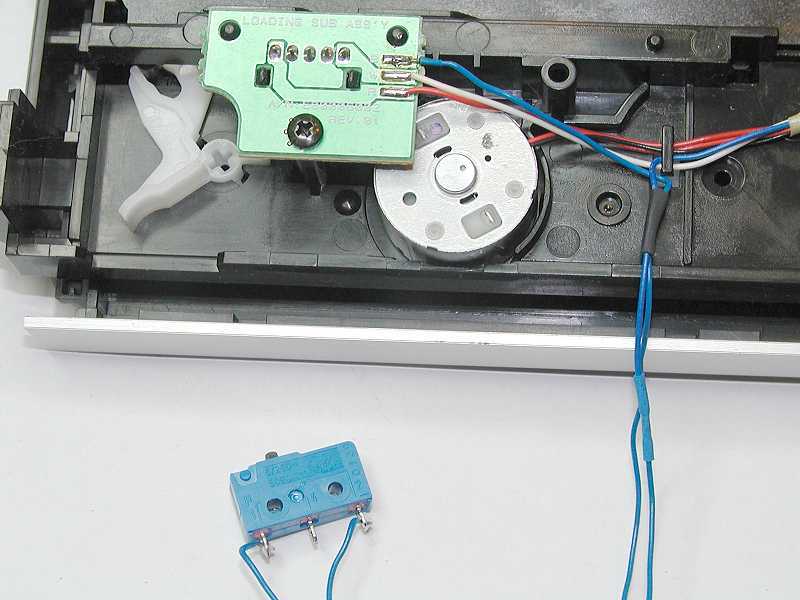 | ein Nachteil dieses Laufwerkes sollte aber auch erwähnt werden. Einen elektrischen Auswurfknopf für die Schublade besitzt dieses Laufwerk nicht. Es läßt sich zwar per Software steuern, aber im Notfall bleibt nur die Möglichkeit die Schublade über den mechanischen Auswurfhebel ( unteres Bild weißer Hebel ) mittels geeignetem Werkzeug auszuwerfen. Dabei wird die Schublade mechanisch bewegt, sodas die Endlagenschalter dann die Schublade freigeben. In den Stromkreis der Endlagenschalter habe ich einen Microtaster geschaltet, welcher betätigt, dann die Schublade öffnet bzw. schließt. | |||||||||||||